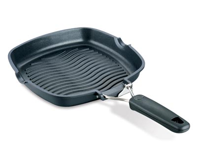 rozměry 20x20 cm vyrobeno z hliníkové slitiny, potažené třemi vrstvami odolného teflonu sklopná plastová rukojeť vhodné pro všechny plotýnky, kromě indukce...