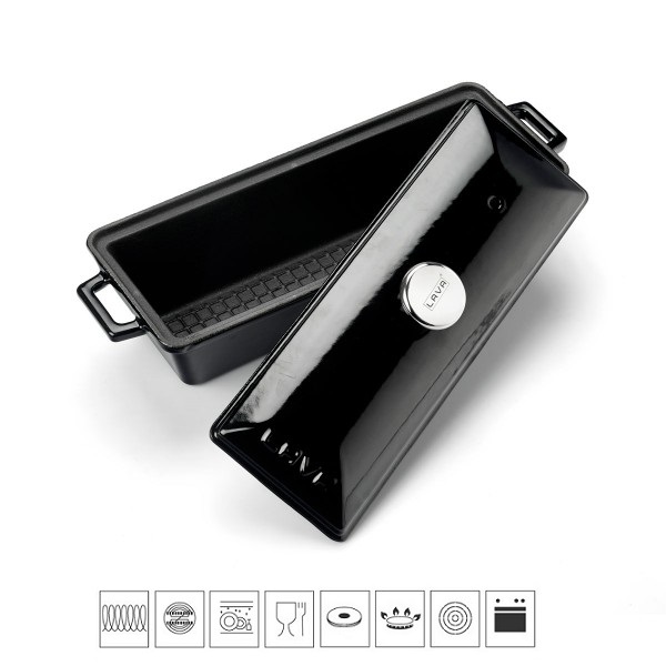 Teriny Lava metal jsou vyrobeny z masivní smaltované litiny s nepřilnavým povrchem. Jsou vhodné pro použití v troubě, připravit v nich můžete buchty nebo pomalu péct maso, skvělé jsou na přípravu domácí paštiky nebo krásně voňavého chleba. Jednoduše multifunkční pomocník. Díky praktickému tvaru a velikosti můžete terinu použít i pro přípravu sladkých dezertů. Ucha po stranách formy usnadňují manipulaci a servírování. Černá s barevně sladěnou poklicí, která je opatřena nerezovým úchytem, má vnitřní rozměry 11×29 cm. Celková délka s úchyty je 33 cm, výška s poklicí 10,8 cm. Mytí v myčce nedoporučujeme, po použití umyjte horkou mýdlovou vodou a otřete dosucha.