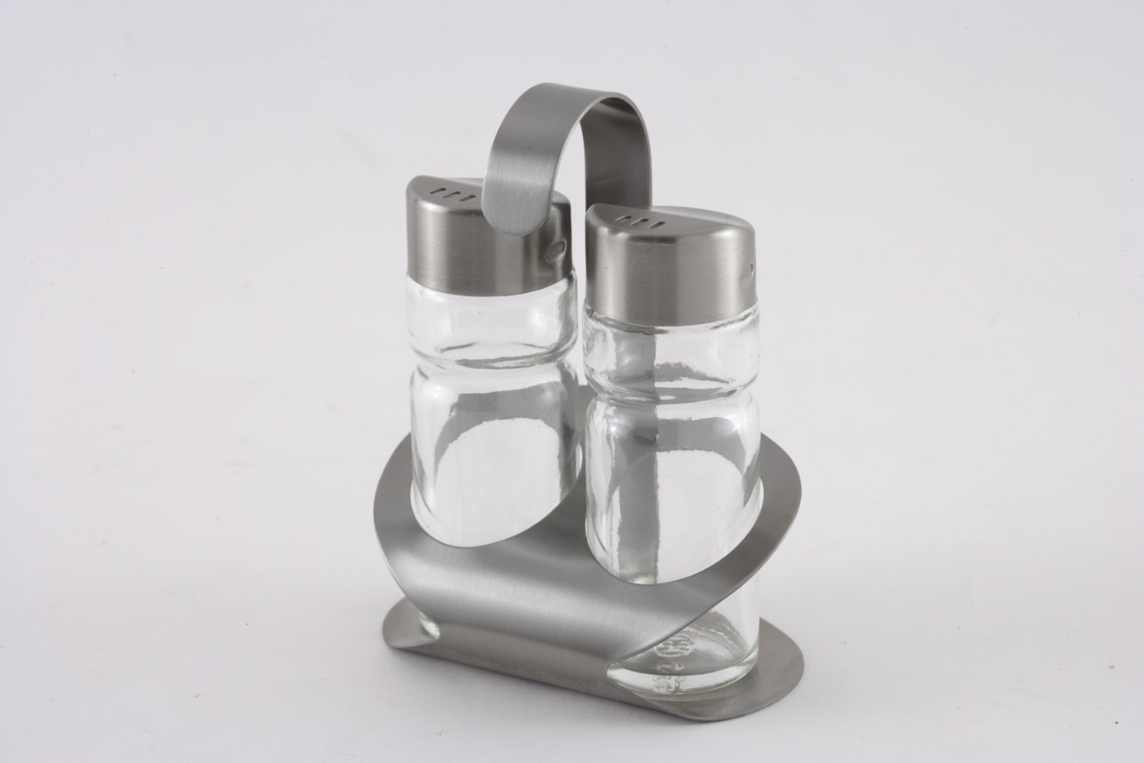Stolní dochucovací souprava. Vhodná pro domácnosti i gastronomická zařízení. Vyrobena z prvotřídní nerezavějící oceli a skla. Výška stojanu 19 cm, výška nádobky 16 cm