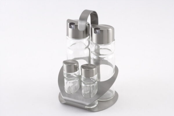 Čtyřdílná stolní dochucovací souprava. Vhodná pro domácnosti i gastronomická zařízení. Vyrobena z kvalitní nerezavějící oceli a skla. Výška stojanu 19 cm, výška nádobek na olej a ocet 16 cm, výška solničky a pepřenky 9 cm.