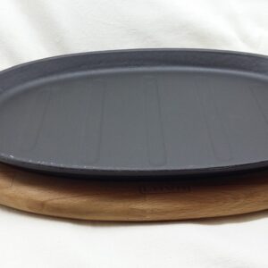 Litinová oválná pánev 18x28cm, výška 3 cm Dřevěný servírovací podstavec pro snadnou manipulaci Tloušťka materiálu - dno 4mm, hrany 3mm...